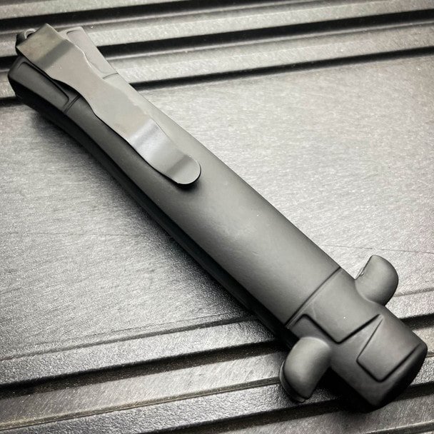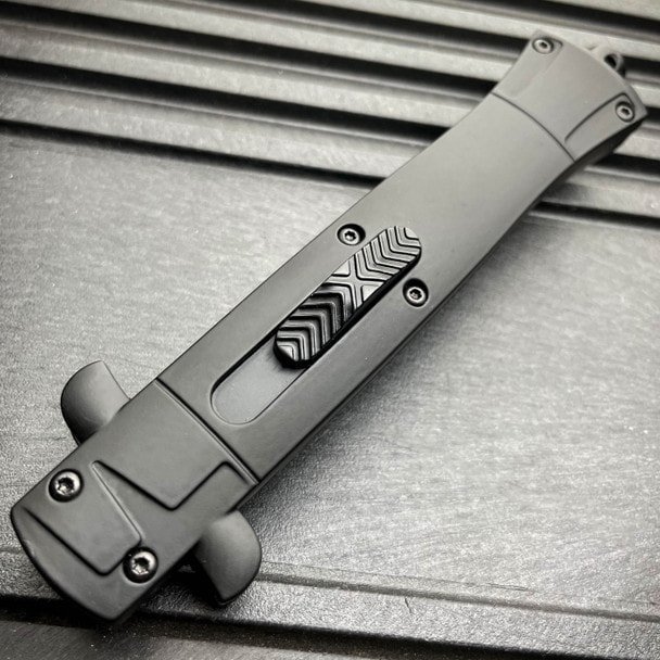 This Auto knife Italian-style 9-inch OTF model features a single-sided style etched bayonet blade and a full aluminum handle with rubber coating.